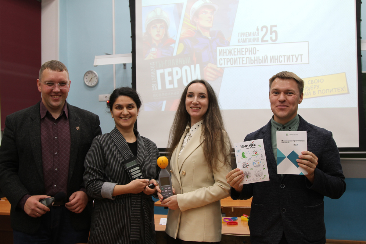 Преподаватели Высшей школы техносферной безопасности Юлия Логвинова, Максим Полюхович, Джамиля Идрисова и Алексей Ульянов провели для учащихся мастер-класс по определению опасных и вредных факторов, воздействующих на человека. С помощью различных устройств школьники исследовали освещённость, шум в помещении и электромагнитное излучение от телефона. Также лицеистов познакомили с трендами строительной отрасли и образовательными траекториями Инженерно-строительного института СПбПУ.